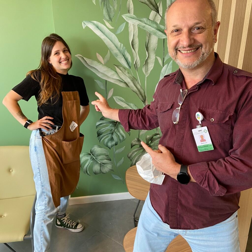 Recebi mais uma visita, essa sim muito especial; meu pai, que trabalhou no hospital desde que eu era pequena, foi lá prestigiar esse trabalho que tive tanto orgulho de mostrar, e ele mais ainda por poder dizer que sua filha tinha deixado sua marca em uma das salas do local que ele trabalhou a vida inteira e tem tanto carinho, deixo aqui o nosso registro bem informal: